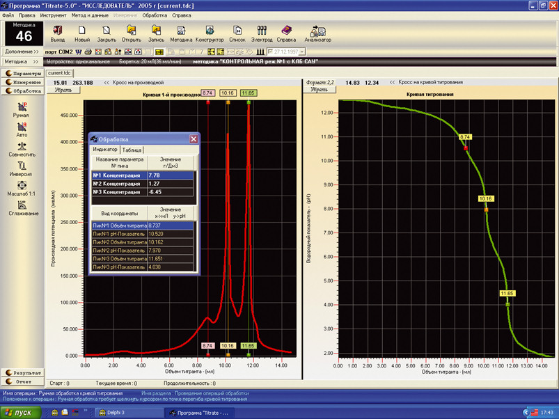 Программный комплекс Titrate-5.0 - современный программный продукт на русском языке с большими аналитическими возможностями и удобным, дружественным интерфейсом, построенным по принципу интуитивности. С помощью данной программы осуществляется полное управление прибором в процессе измерений, проводится обработка данных, рассчитываются метрологические характеристики полученных результатов, реализуется хранение информации и печать протоколов измерений.