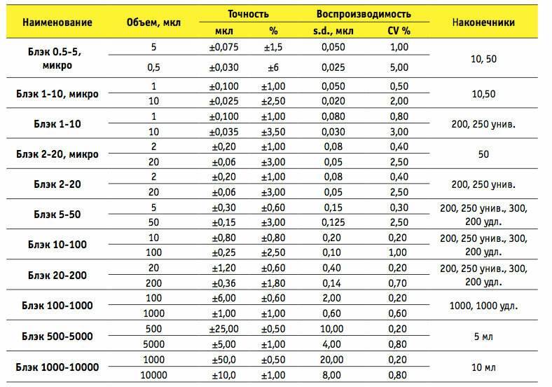 • одноканальные пипетки Блэк постоянного объема: 1, 5, 10, 20, 25, 50, 100, 200, 250, 500, 1000 мкл;